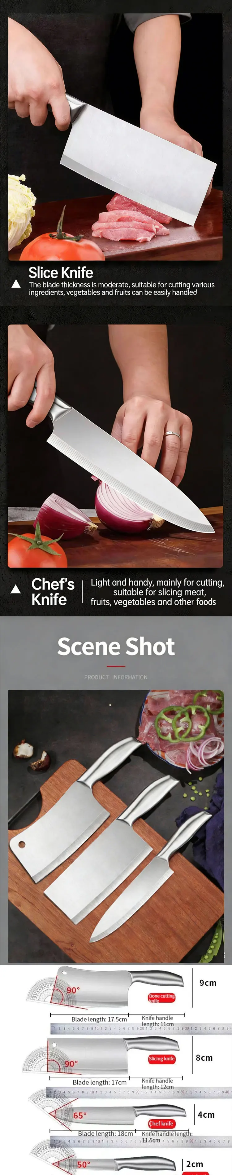 The bone cutter (65° angle) delivers powerful, controlled force for joints and ribs. The chef knife (50° angle) offers versatility for slicing and dicing. Each blade’s angle is engineered to maximize cutting efficiency and reduce effort.